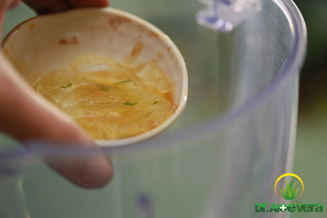 4- محتویات مخلوط کن را داخل ظرف بریزید.مطمئن شوید که ژل های آلوئه ورا خوب مخلوط شده،در غیر اینصورت تکه های بزرگ آلوئه ورا به موهای شما چسببیده و در موهای شما گیر میکند.